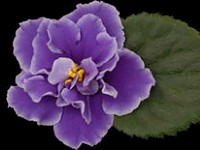 Semidouble stars in tones of blue-purple, have frilly white edges. A heavy blooming semiminiature with deep green, pebbly & pointed foliage, sporting a red reverse.