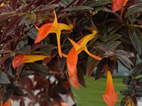 Large, golden orange and yellow flowers with small, dark coppery, red-backed, semi-trailing foliage. Striking combination!
