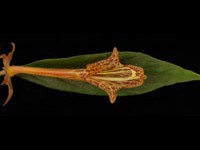 Spindly, dark green leaves are slightly hairy. Blooms have a fuzzy red calyx, deep purple-maroon tube and lower petals, with lemon yellow upper petals, and antenna-like protrusions. A must see to appreciate!