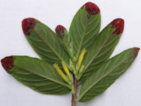 Bronzy and green leaves with golden flowers that show a scarlet overlay. This variety grows large.