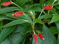 Small , pouched shaped, bright red flowers, over medium green, pointed foliage. Spreading habit.