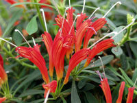 Vibrant, deepest red tubular flowers are produced on semi-trailing green foliage. This hardy grower is heavy blooming, and spectacular.