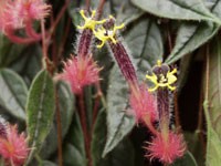 Spindly, dark green leaves are slightly hairy. Blooms have a fuzzy red calyx, deep purple-maroon tube and lower petals, with lemon yellow upper petals, and antenna-like protrusions. A must see to appreciate!
