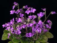 Originating in Indo-China, these compact gesneriads, affectionately referred to as "pets", have blooms reminiscent of wild violets and symmetrical growing habits. We find that they grow very well with low to medium light levels, cooler temperatures, and a minimum of water and fertilizer. Requirements for artificial lighting would be around 8 to 10 hours. They will do well on the bottom shelf of "light stands" and near the end of the fluorescent light tubes. Use a light, porous potting mix, and grow them in small pots! Let the soil become fairly dry between waterings. They also do very well when "wick watered." Feed plants regularly, using a well balanced fertilizer, at ΒΌ tsp. per gallon of water, with every watering.